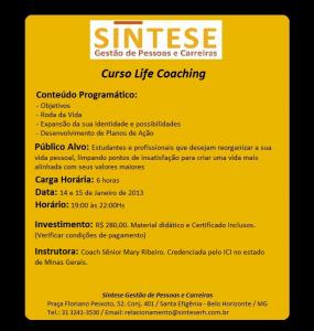A Síntese Gestão de Pessoas e Carreiras oferece nos dias 14 e 15 de Janeiro de 2013 o curso de Life Coaching que tem por objetivo ajudar o cliente a reorganizar a sua vida pessoal, limpando pontos de insatisfação para criar uma vida mais alinhada com seus valores maiores.
